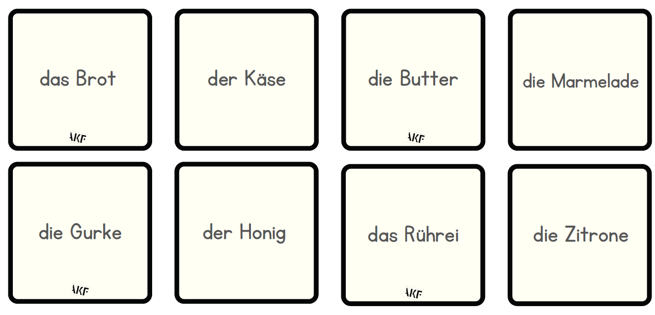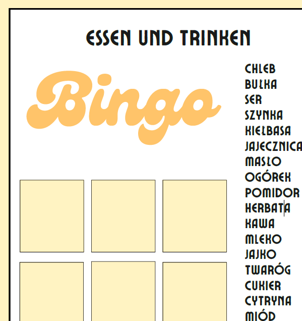 • gra bingo ( uczniowie wpisują w wolne cegiełki podane po prawej stronie nazwy po polsku lub po niemiecku a nauczyciel wypowiada je w różnej kolejności w języku niemieckim. Każdy gracz szuka na swojej karcie wypowiedzianego przez nauczyciela lub wylosowanego słowa  i jeżeli je znajdzie, zakrywa ją żetonem albo przekreśla. Prowadzący kontynuuje wyczytywanie słów dopóki któryś z graczy nie uformuje określonego wzoru na swojej planszy (jedna linia, dwie linie, cała plansza) i nie wykrzyczy bingo.